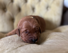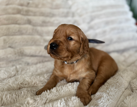 Teton Rivers Red Fisher is a beautiful dark red boy who resides in Idaho! He is a AKC and DNA registered. He is a happy, smart, gentle, fun loving boy! He is a real gentleman in every way. Fisher is Genetically Clear on DM, GRPRA 1, GRPRA 2, ICH, MD, NCLGR, and prcd. He is DNA, OFA Hips , Heart, & Elbows, Pennhip with good ratings. His pedigree chart is on K9data.com.